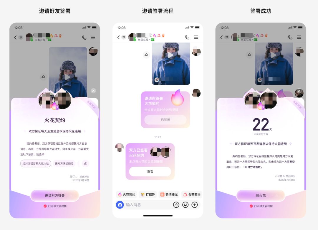 其次,火崽崽的诞生也并非凭空捏造了一个新需求。从其名称就能看出,它其实来源于快手已经有的“火花”体系:用户与朋友互动聊天后,系统会自动点亮火花图标,象征关系的紧密度。