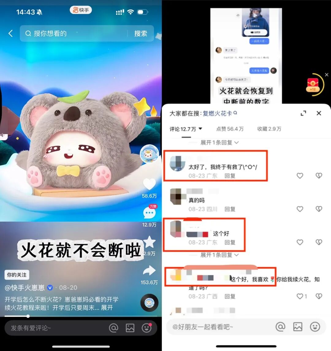 今年开学季,很多大学生党焦虑“开学了,火花要断了”,团队看到用户的心声后,官方账号发布这条“救星”般的规划优化视频后,1小时内被分享了44万次,并冲上了快手热榜第一名,单条视频就带来了近18万用户通过“分享”进入火崽崽。这一变化不仅避免了暑期结束后流量下滑的问题,反而还带来了一个活跃度新高峰。